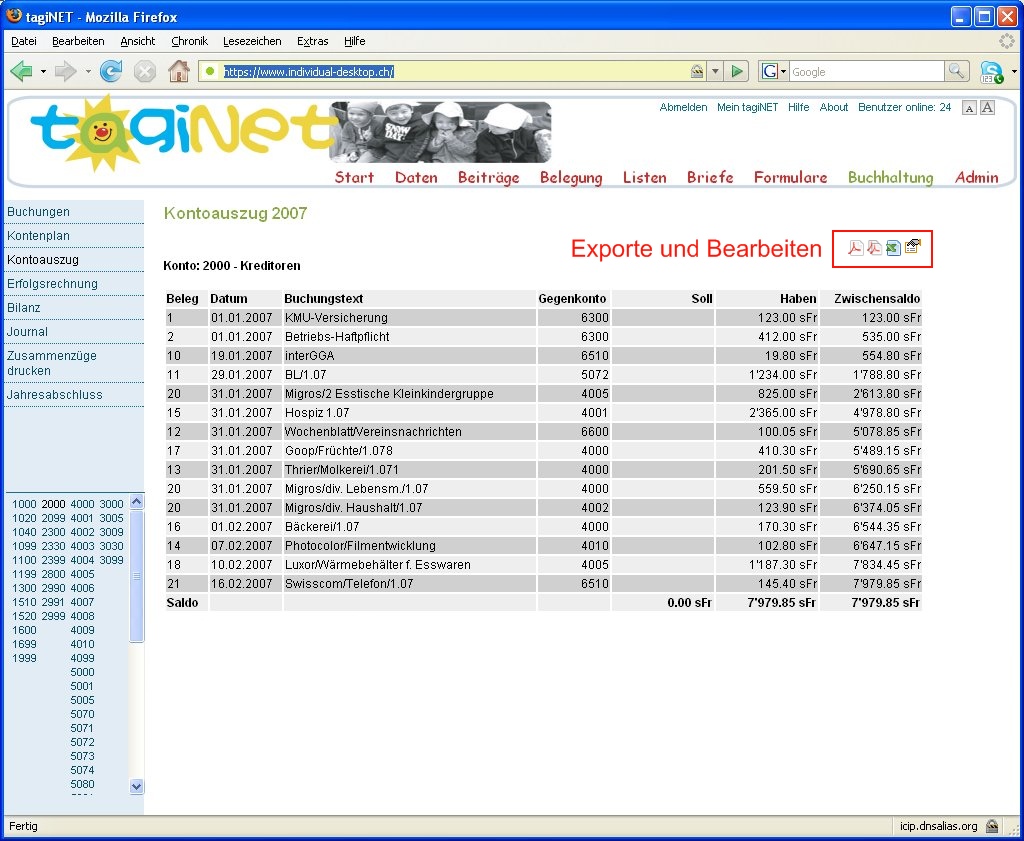 Hier können Sie von allen Konten einen Kontoauszug anzeigen lassen und diesen gegebenenfalls als PDF- oder Excel-Datei exportieren (mit den Symbolen oben rechts). Das angezeigte Konto können Sie unten links auswählen.