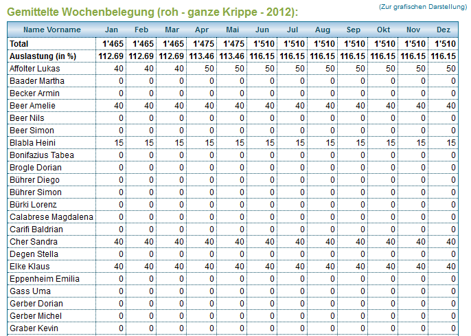 Zeigt die Auslastung einer Krippe innerhalb eines Jahres in % tabellarisch an. Bei Klick auf „Zur grafischen Darstellung“ sind Sie bei der grafischen Jahresübersicht.