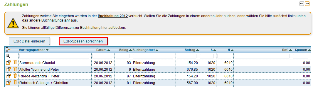 Wenn Sie auf „ESR-Spesen abrechnen“ drücken, berechnet tagiNet die Spesen, welche durch Zahlungen der Vertragspartner entstanden sind. Daraus ergibt sich untenstehende Darstellung: