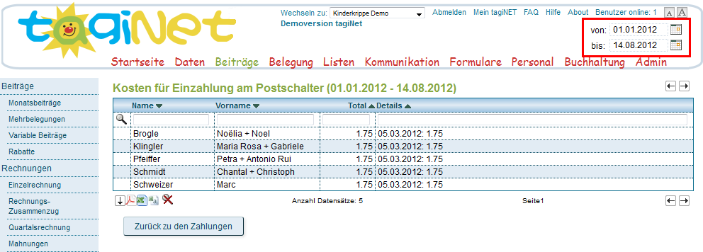 Um die ESR-Spesen für einen gewünschten Zeitraum anzeigen zu lassen, muss oben rechts das Stichdatum abgeändert werden. Aufgrund der gesetzten Stichdaten werden die entsprechenden Vertragspartner und deren ESR-Spesen aufgelistet.