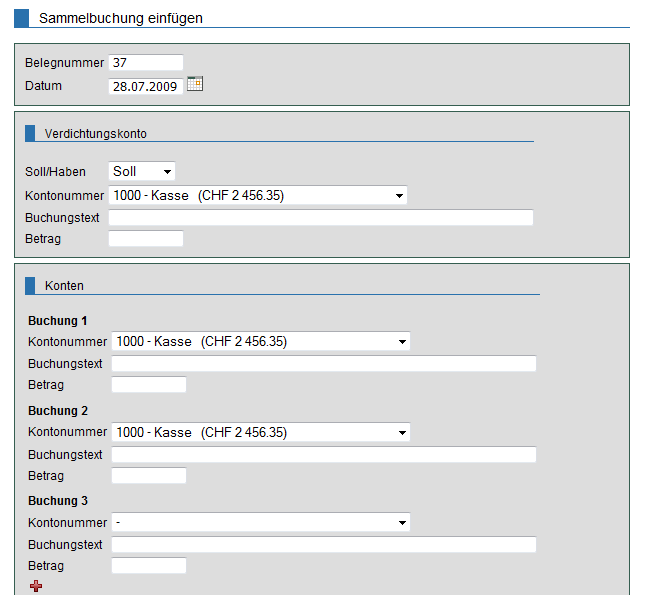Mit dem Link „Neue Sammelbuchung einfügen“ können Sie eine Sammelbuchung erfassen. Dabei wählen Sie in der Maske das Verdichtungskonto aus und legen fest, ob dieses Konto auf der Soll- oder Haben-Seite erscheinen soll. Das Verdichtungskonto stellt das Konto dar, auf das alle Buchungen lauten sollen (z.B. Bank oder Post).Dabei geben Sie das Gesamttotal ein, das die nachfolgenden Beiträge ergeben. Anschliessend können Sie unter „Konten“ zwei oder mehrere Gegenkonten mit dem jeweiligen Betrag eingeben. Das Buchhaltungsmodul überprüft automatisch, ob die Summe dieser Beträge dem Betrag unter dem Verdichtungskonto entspricht.