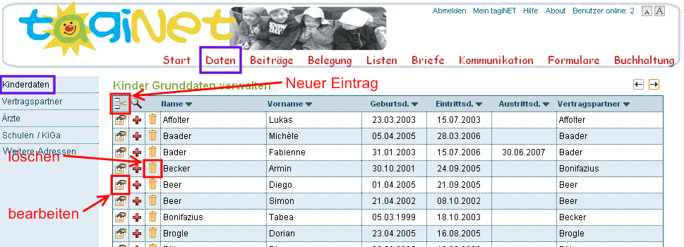 Die Tabelle „Kinderdaten“ weist eine Spezialfunktion auf, welche Sie durch einen Klick auf