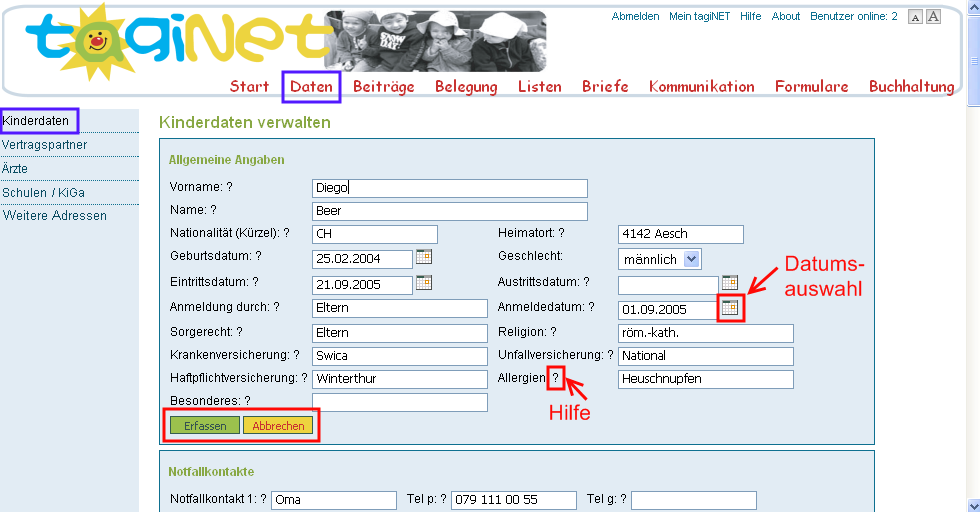 Das Erfassen und Bearbeiten der Grunddaten (Kinderdaten, Elterndaten, Ärzte, Schulen/KiGa und weitere Adressen) ist unter dem Hauptmenüpunkt Daten möglich. Dazu können Sie auf einen der 5 Punkte im Untermenü links klicken. Als Beispiel ist hier der Punkt „Kinderdaten“ aufgeführt: