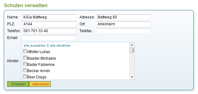 Auf der Erfassungsmaske der Schulen erfassen Sie den Namen, die Adresse sowie die Telefonnummer der Schule. Gleichzeitig können Sie angeben, welche Kinder diese Schule besuchen. Die Zuordnung Schule-Kind kann auch auf der Erfassungsmaske der Kinder-Grunddaten vorgenommen werden, wobei dort auch die Lehrperson sowie deren Telefonnummer angegeben werden kann.