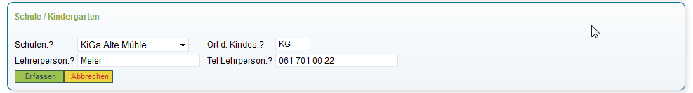 Unter dem Abschnitt Schule / Kindergarten können Sie die Schule / den Kindergarten angeben, den das Kind besucht. Zusätzliche Schulen können Sie unter „Daten“/ „Schulen“ eingeben. Zusätzlich können Sie die Lehrperson sowie deren Telefonnummer direkt in der Maske erfassen: