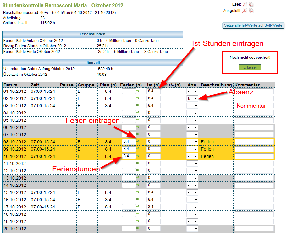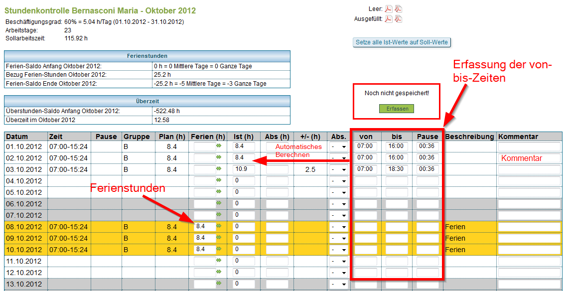 Die tatsächlich geleistete Arbeitszeit (Ist-Stunden) sowie die bezogenen Ferienstunden (und auch allfällige Absenzen) werden auf der „Stundenkontrolle“ erfasst. Eine Erfassung dieser Daten unter den Menüpunkten „Arbeitszeit (Ist)“ sowie „Ferien“ wird nicht empfohlen.