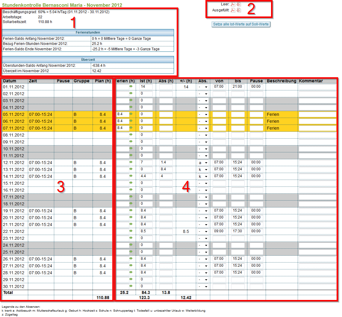 1. Die obere Hälfte gibt Auskunft über den momentanen „Kontostand“ des Angestellten: Es ist der Feriensaldo sowie der Überstundensaldo per Anfang Monat gezeigt.
