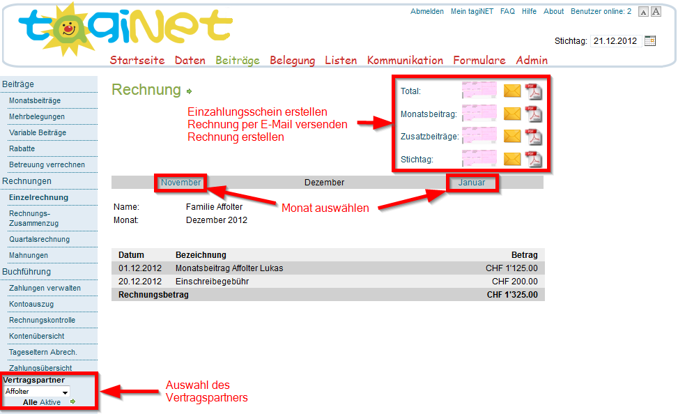 TagiNet kann aufgrund der erfassten Monatsbeiträge und der variablen Beiträge (sowie Rabatten und Mehrbelegungen) Rechnungen pro Vertragspartner generieren. Die Rechnungen können Sie unter „Beiträge“/ „Einzelrechnung“ erstellen: