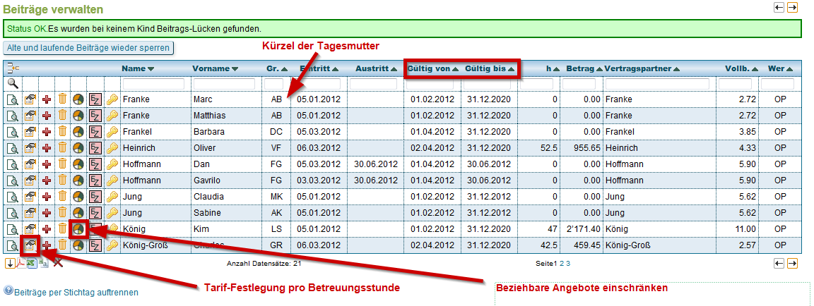 Die Betreuung der Kinder wird unter den Menüpunkten „Beiträge“ / „Tarif + Belegung“ sowie „Beiträge“ / „Betreuung verrechnen“ verrechnet.