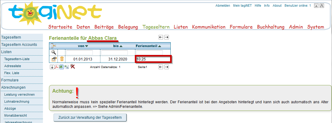 Normalerweise sollte es aber nicht nötig sein, pro Tagesfamilie hier einen speziellen Prozent-Satz zu hinterlegen; da bei den verschiedenen Angeboten ein Standard-Ferienanteil hinterlegt ist. Zudem gibt es unter „Admin / Ferienanteile global“ die Möglichkeit, den Prozentsatz altersabhängig zu hinterlegen.